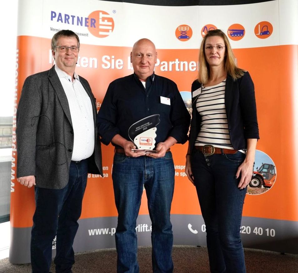 Foto zeigt (v. l. n. r.):Kai Schliephake (Geschäftsführer von Partnerlift), Peter Wendel (Inhaber Peter Wendel Arbeitsbühnen),Katrin Büher (Head of Marketing, Quality Management and Training Partnerlift)